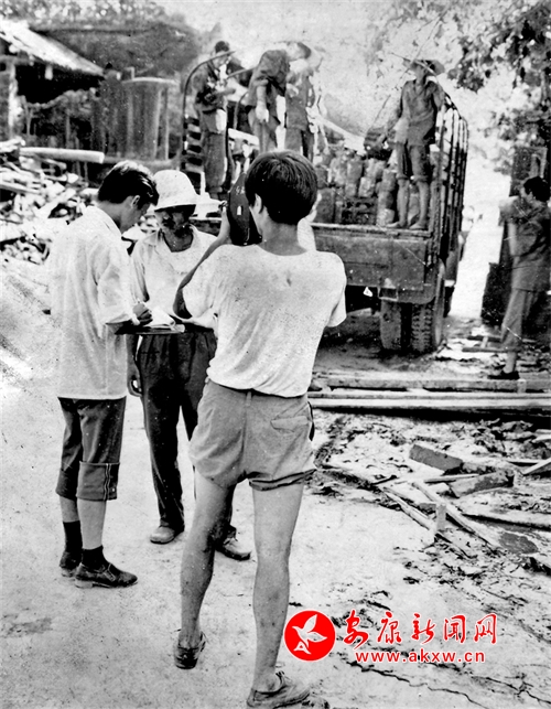 一輛“解放”牌大卡車,不知道從啥地方被洪水推到這里了。兩位解放軍戰(zhàn)士手拿鋼探條,坐著皮筏子在扎探有沒有死亡的人。我拍下照片,如今這幅圖片網(wǎng)上可以找到。