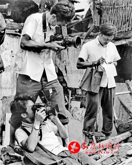 安康地區(qū)群藝館李西平(左一)當(dāng)年拍攝的戰(zhàn)士手流鮮血待命的圖片獲“大眾攝影”年賽一等獎(jiǎng)。地委宣傳部的宋選成(左三,已病逝)拍攝了倒塌前的邦克樓。陜西日報(bào)社胡武功(左四)的作品《當(dāng)洪水襲來之際》獲得當(dāng)年最佳新聞攝影獎(jiǎng)。安康日報(bào)社記者張會(huì)鑒(左五,已病逝)正在采訪中。蘭州某部隊(duì)的王紅(右一)。