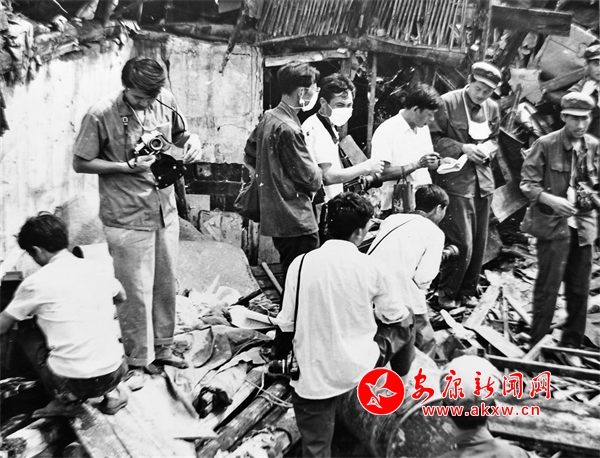 當(dāng)年我的辦公室,也就成為我們的居住地。所好的是,報(bào)社的員工和家屬?zèng)]有一個(gè)人遇難。也就是從這天開始,我每天騎車子進(jìn)城采訪拍照。到了晚上我拖著疲憊的雙腿走進(jìn)暗房沖洗膠卷,等膠卷徹底干了,放大版面需要的新聞圖片。這樣的活,我還沒有等到天亮就完事了。待畫版面的余鶴齡(病逝了)和趙紅橋上班了,我的圖片已經(jīng)放在他們的辦公桌上了。
