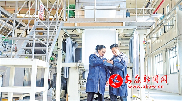 陜西鼎澈膜科技有限公司車間內(nèi),工作人員在核對(duì)生產(chǎn)數(shù)據(jù)。