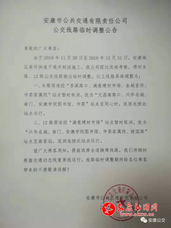 2018年11月30日至2018年12月31日,由于安康城區(qū)南環(huán)快速干道半封閉施工,8路、12路公交線路具體調(diào)整為: