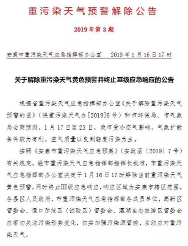 按照《安康市重污染天氣應(yīng)急預(yù)案》(安政函〔2019〕7號)有關(guān)規(guī)定,經(jīng)市重污染天氣應(yīng)急指揮部指揮長批準(zhǔn),市重污染天氣應(yīng)急指揮部辦公室決定于1月16日17時解除當(dāng)前重污染天氣黃色預(yù)警,同時終止Ⅲ級應(yīng)急響應(yīng),響應(yīng)區(qū)域為安康市轄區(qū)范圍。各縣區(qū)人民政府,市重污染天氣應(yīng)急指揮部各成員單位,高新區(qū)管委會、恒口示范區(qū)(試驗區(qū))管委會、瀛湖生態(tài)旅游區(qū)管委會應(yīng)密切關(guān)注污染形勢變化,切實加強污染源管控,主動應(yīng)對重污染天氣。SPt安康新聞網(wǎng)