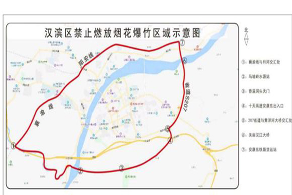 漢濱區(qū)禁止燃放煙花爆竹的區(qū)域:西起襄渝線與月河交匯處向南至馬坡嶺水源站,南起馬坡嶺水源站、香溪洞頭天門至十天高速安康東出入口,東起207省道與黃洋河大橋交匯處向北至安康東鐵路貨運(yùn)站,北起安康東鐵路貨運(yùn)站經(jīng)陽安線、襄渝線與月河交匯處。