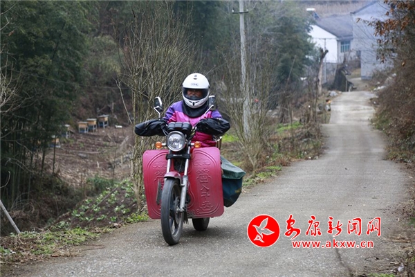 新春之際,陜南天氣依然寒冷。趙明翠戴上頭盔,捆綁好厚厚的護(hù)膝,艱難得跨上摩托車,點(diǎn)火起步出發(fā),開(kāi)始了一天的投遞工作。記者驅(qū)車緊跟隨其后,在很多拐彎和上下坡路段,我們看到趙明翠為了平衡摩托車,經(jīng)常是兩腳尖著地。