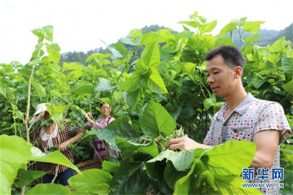 饒峰鎮(zhèn)新華村的養(yǎng)蠶戶邱紅軍(右)在自家的桑樹園內采摘桑葉(9月6日攝)。