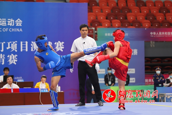 “開始!”隨著裁判員口令,紅藍(lán)雙方運(yùn)動員立即展開了激烈的爭奪,賽場上他們毫無畏懼,拳法剛勁兇猛,腿法雷霆萬鈞,摔法干脆利落。“拳腿結(jié)合”“主動點”場下教練不時提醒。觀眾席不斷響起熱烈的掌聲。