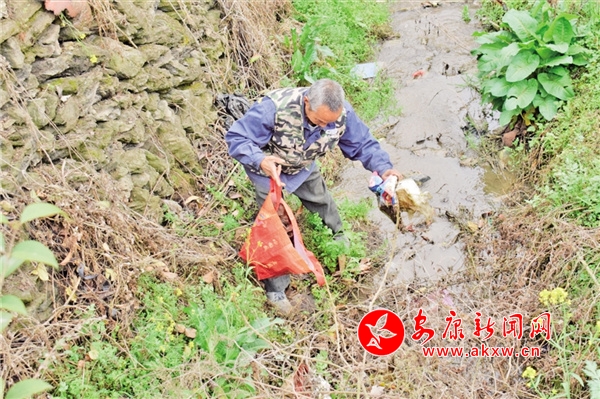 “我前兩天看溝里石頭堆中間有一件被丟掉的衣服,得趕緊撈出來,可不敢等到春天雨水多了。”李輝智回頭對章彩云說,“那是的,現(xiàn)在溝里干凈著呢,我一會兒回家找個(gè)長竹竿把衣服勾出來,不能讓這些影響了水質(zhì)。”章彩云回應(yīng)道。