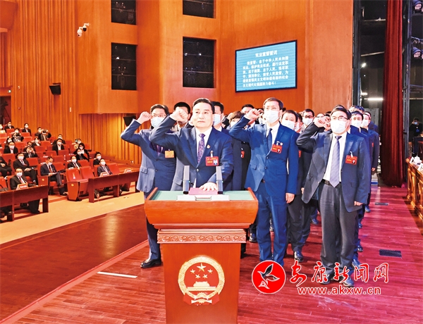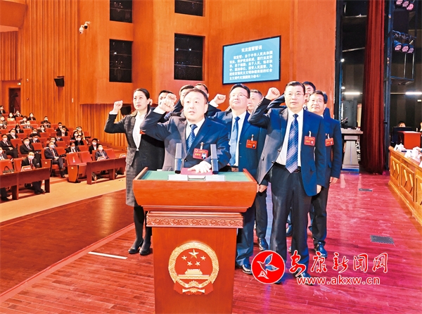 新當(dāng)選的市級(jí)國家機(jī)關(guān)工作人員向憲法宣誓,新當(dāng)選的市五屆人大常委會(huì)主任王彪、市人民政府市長武文罡分別領(lǐng)誓。