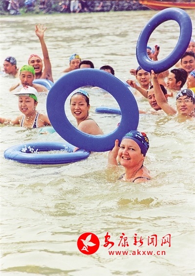 第一屆龍舟節(jié)的游泳隊(duì)中還有英國(guó)支教老師琳達(dá)的身影。吳永東 攝