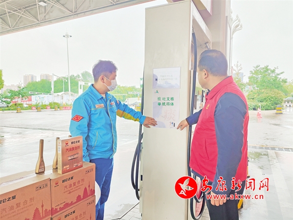志愿者在加油站張貼宣傳頁(yè)