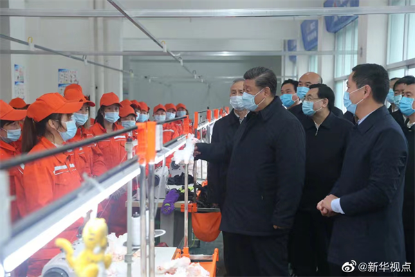 2020年4月21日,習(xí)近平總書(shū)記在安康市平利縣老縣鎮(zhèn)錦屏社區(qū)考察社區(qū)毛絨玩具廠(chǎng)