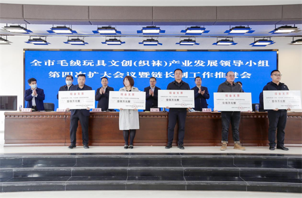 2022年10月18日,全市毛絨玩具文創(chuàng)(織襪)產(chǎn)業(yè)發(fā)展領(lǐng)導(dǎo)小組第四次擴(kuò)大會(huì)議上表彰兌現(xiàn)了一次性獎(jiǎng)補(bǔ)資金1000萬(wàn)元