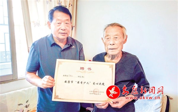 安康市書(shū)香少兒讀書(shū)會(huì)負(fù)責(zé)人李煥龍為鄺民三送上“愛(ài)心大使”聘書(shū)。