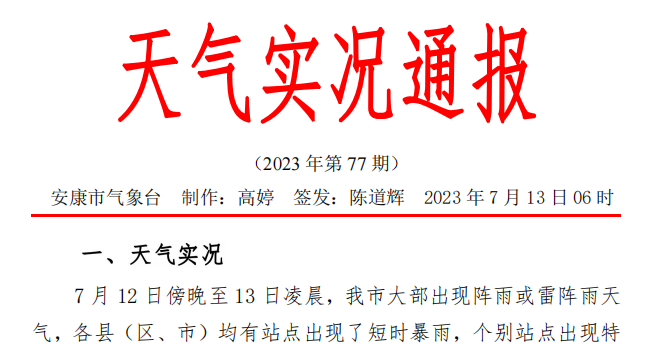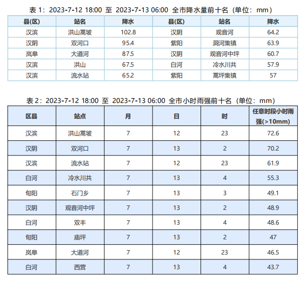 7月12日傍晚至13日凌晨,我市大部出現(xiàn)陣雨或雷陣雨天氣,各縣(區(qū)、市)均有站點出現(xiàn)了短時暴雨,個別站點出現(xiàn)特大暴雨(≥50毫米/小時),部分地區(qū)出現(xiàn)了6—8級短時大風和強雷電。據(jù)統(tǒng)計,過去12小時(2023年7月12日18時至7月13日06時)全市共有191個氣象監(jiān)測站出現(xiàn)了降雨,累計降水量5毫米(中雨)以上有138站,15毫米(大雨)以上有94站,30毫米(暴雨)以上有47站,70毫米(大暴雨)以上有3站,其中單站雨量最大為漢濱區(qū)洪山蒿坡氣象監(jiān)測站102.8毫米,最大小時雨強出現(xiàn)在漢濱區(qū)洪山蒿坡72.6毫米(7月12日22時-23時)。安康城區(qū)氣象監(jiān)測站38.6毫米。