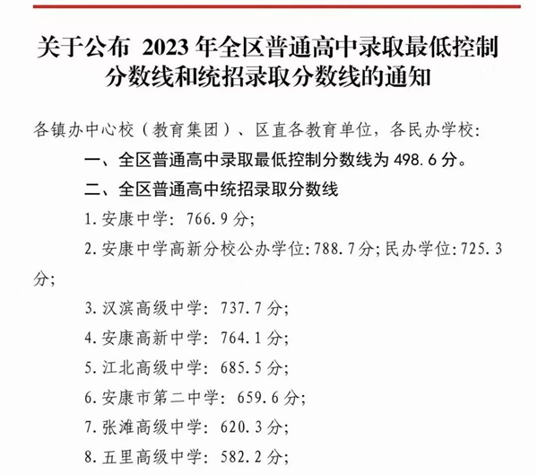 7月13日,漢濱區(qū)教育體育局、高新區(qū)教育體育局、恒口示范區(qū)教育體育局聯(lián)合發(fā)布《關于公布2023年全區(qū)普通高中錄取最低控制分數(shù)線和統(tǒng)招錄取分數(shù)線的通知》:M6n安康新聞網(wǎng)