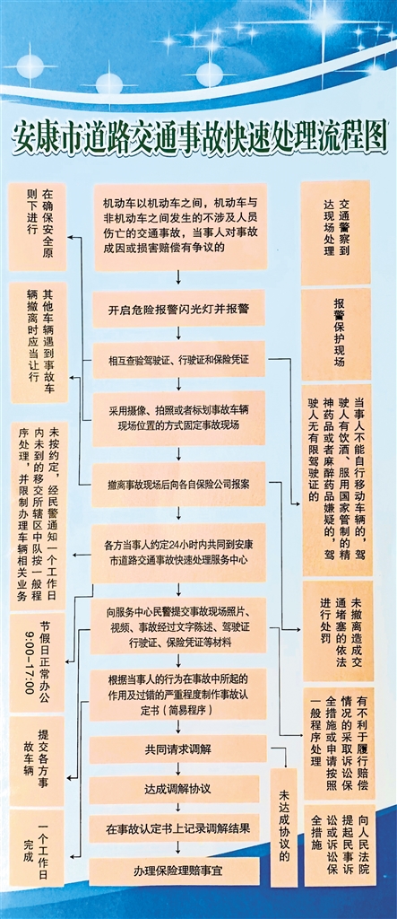為減少因發(fā)生交通事故導(dǎo)致的擁堵,提高交警交通事故處理工作效率,提供快捷的車輛保險理賠維修等相關(guān)服務(wù),緩解交通壓力,保障市民安全暢通出行。2015年我市成立了道路交通事故快速處理服務(wù)中心(以下簡稱快處中心)受理安康市城市規(guī)劃區(qū)內(nèi)(包括漢濱區(qū)、高新區(qū)、瀛湖風(fēng)景區(qū))發(fā)生的輕微交通事故。