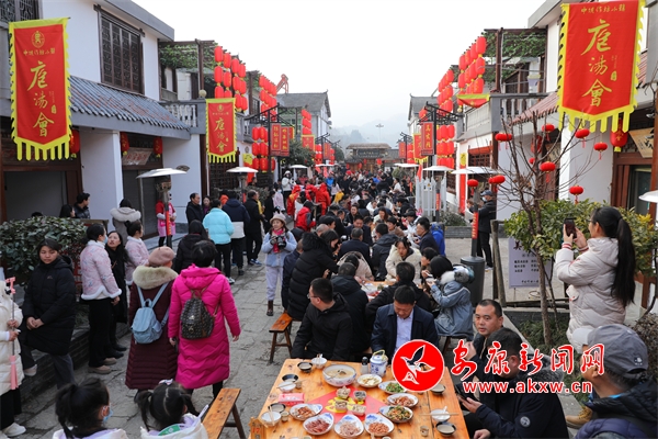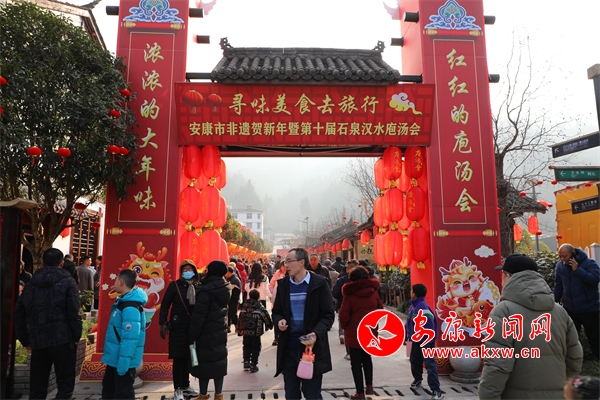 走進(jìn)石泉縣中壩作坊小鎮(zhèn),大紅燈籠高高掛,山貨特產(chǎn)來云集,洋溢著喜慶的過年氛圍。隨著打連錢、舞彩獅、抬花轎、采蓮船等民俗展演活動開始,中壩文化休閑廣場上人山人海,熱鬧非凡。陜北民歌手、安康小場子、漢調(diào)二黃等非遺傳承“文化走親”活動,更是給廣大游客和城鄉(xiāng)群眾帶來豐富多彩的文化體驗(yàn)。“上菜嘍——”隨著一聲長長的吆喝聲,最具年俗特色的庖湯宴開始了,方桌板凳擺長街,用剛剛宰殺的新鮮豬肉烹飪出的各色陜南傳統(tǒng)美食,吸引了眾多鄉(xiāng)親和游客來品嘗。