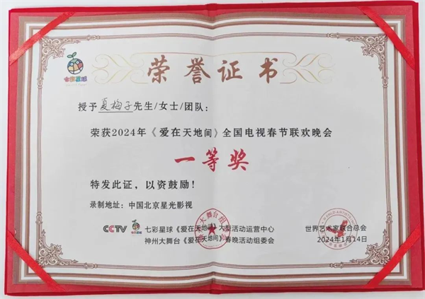 1月15日,《愛在天地間》全國電視春節(jié)聯(lián)歡晚會在京錄制圓滿成功。晚會由劉相周擔任總導演,邀請有春雷、王琪、烏蘭托婭、夏梅子等多位嘉賓,分別表演了多個精彩節(jié)目。夏梅子在這次晚會上演唱了陜南民歌《幸福歌兒唱安康》并榮獲一等獎。