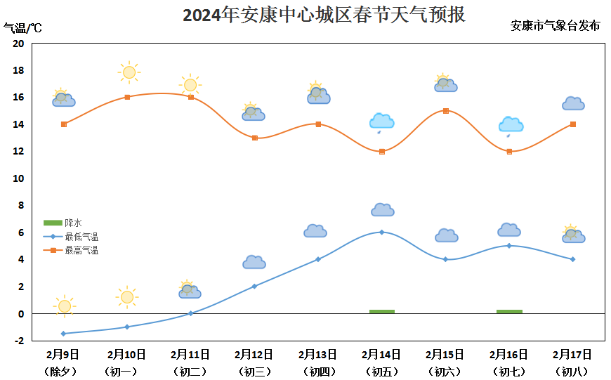 春節(jié)期間冷空氣對(duì)我市影響較小,最高氣溫起伏不大,預(yù)計(jì)川道地區(qū) 11~18℃,秦巴山區(qū):8~14℃,最低氣溫初三以前相對(duì)較低,后期有所升高:川道地區(qū) -2~5℃,秦巴山區(qū):-5~1℃。