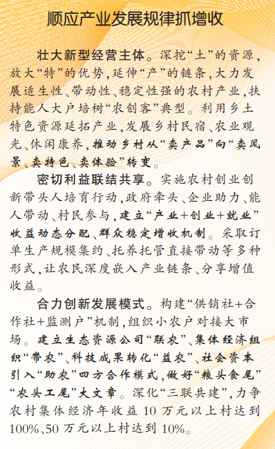 把握市場(chǎng)運(yùn)行規(guī)律抓改革。用活土地要素。統(tǒng)籌農(nóng)村“三塊地”改革,扎實(shí)推進(jìn)承包地延期,在農(nóng)民自愿前提下實(shí)施農(nóng)田集中連片整理。加強(qiáng)農(nóng)村宅基地管理,嚴(yán)格落實(shí)“一戶(hù)一宅”政策。探索集體經(jīng)營(yíng)性建設(shè)用地“同等入市、同權(quán)同價(jià)”,兼顧國(guó)家、農(nóng)村集體經(jīng)濟(jì)組織和農(nóng)民利益。配置流動(dòng)要素。順應(yīng)人口流動(dòng)和產(chǎn)業(yè)發(fā)展趨勢(shì),提高城鄉(xiāng)要素雙向協(xié)同效率,推動(dòng)要素市場(chǎng)化改革。促進(jìn)有能力在城鎮(zhèn)穩(wěn)定就業(yè)和生活的農(nóng)業(yè)轉(zhuǎn)移人口有序市民化,落實(shí)常住地提供基本服務(wù)制度。集成治理要素。深化“五治融合”創(chuàng)新舉措,實(shí)施農(nóng)村基層治理提升工程。