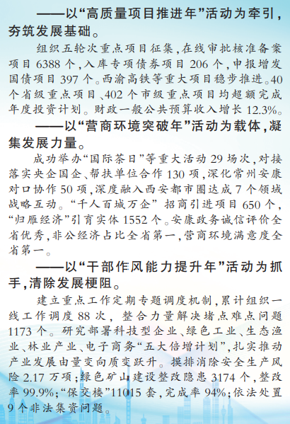 社會(huì)治理堅(jiān)實(shí)穩(wěn)固。安全監(jiān)管有力。未發(fā)生重大及以上生產(chǎn)安全事故。組建819支應(yīng)急救援隊(duì)伍,落實(shí)2966處地質(zhì)災(zāi)害隱患監(jiān)測(cè)預(yù)警,成功應(yīng)對(duì)17輪次強(qiáng)降雨。社會(huì)穩(wěn)定有序。信訪(fǎng)法治化試點(diǎn)全省先行,信訪(fǎng)工作綜合考核名列全省第一。創(chuàng)新舉措有效。村財(cái)審計(jì)監(jiān)督在全國(guó)成為經(jīng)驗(yàn)。社會(huì)治理“安康模式”全省推廣,平安建設(shè)滿(mǎn)意度全省第一,獲評(píng)“全國(guó)市域社會(huì)治理現(xiàn)代化試點(diǎn)合格城市”。