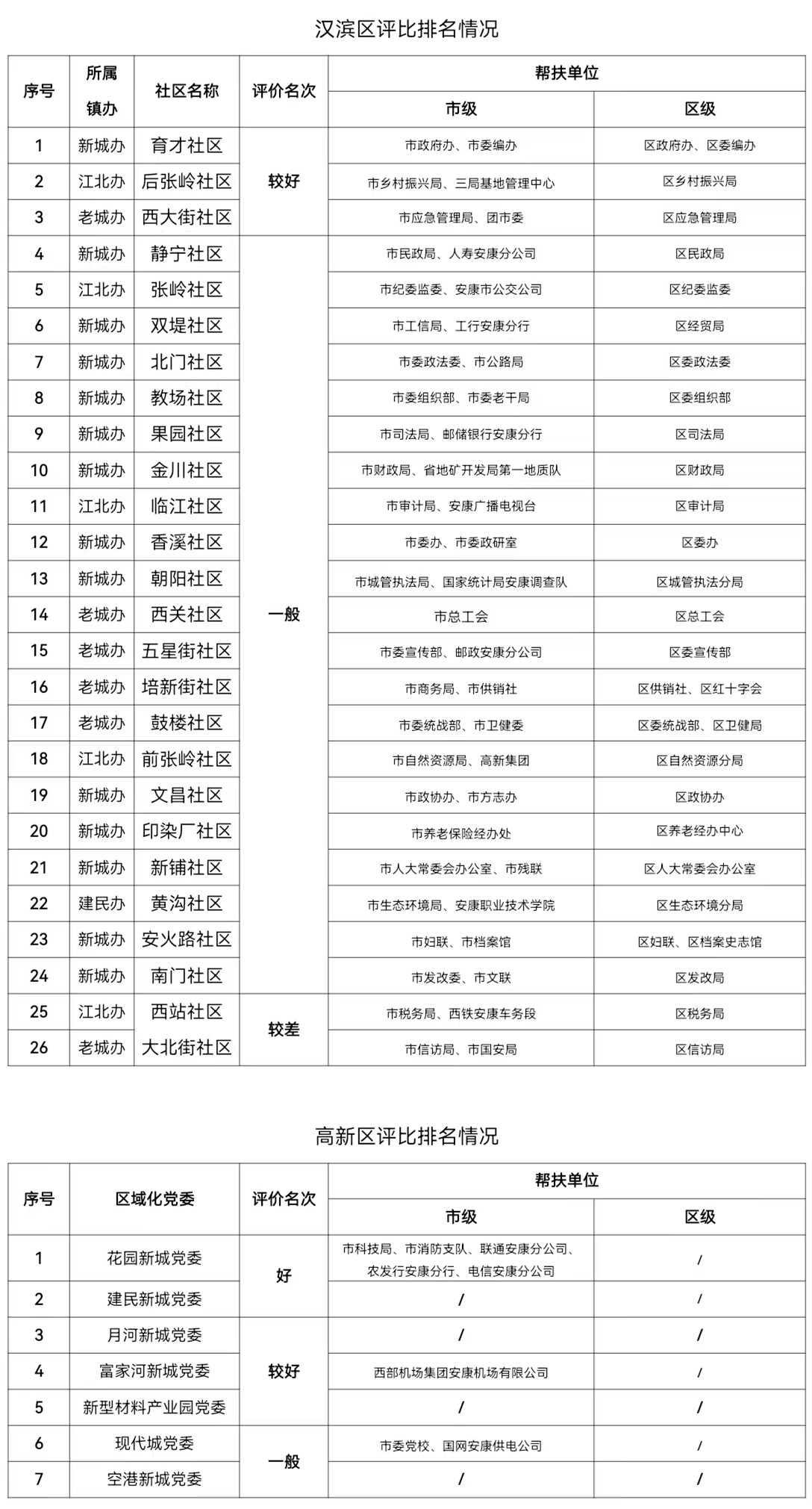 按照市創(chuàng)文辦《關(guān)于扎實(shí)開展全域評比排名工作的通知》(安創(chuàng)文辦發(fā)〔2023〕2號)要求,近期,漢濱區(qū)、高新區(qū)組織對各鎮(zhèn)辦、區(qū)域化黨委、社區(qū)(村)、托管村創(chuàng)文階段性工作成效進(jìn)行了評比排名,現(xiàn)將結(jié)果通報(bào)如下: