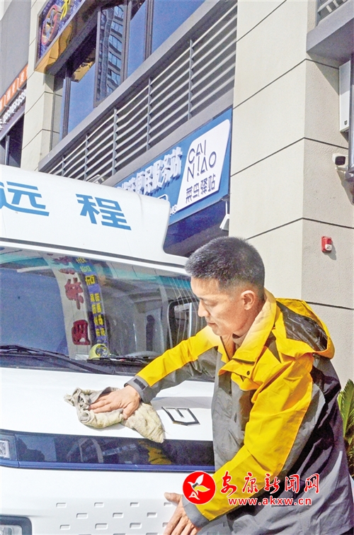 ④新能源貨車(chē)駕駛員王道鵬正在清潔車(chē)輛。記者 陳楚珺 攝