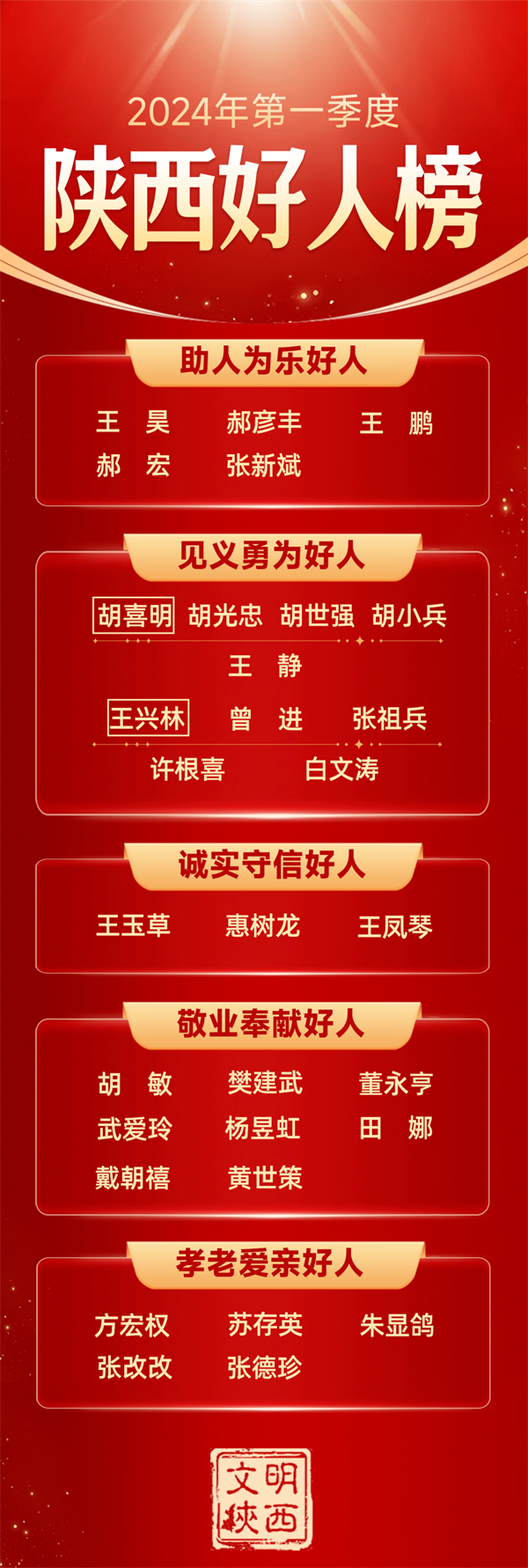 4月25日下午,2024年第一季度陜西好人榜發(fā)布儀式暨道德模范與身邊好人現(xiàn)場(chǎng)交流活動(dòng)在西安市高陵區(qū)舉辦 。我市助人為樂(lè)好人張新斌,見(jiàn)義勇為好人王興林、曾進(jìn)、張祖兵,誠(chéng)實(shí)守信好人王鳳琴光榮上榜,一起來(lái)看看他們的光榮事跡。