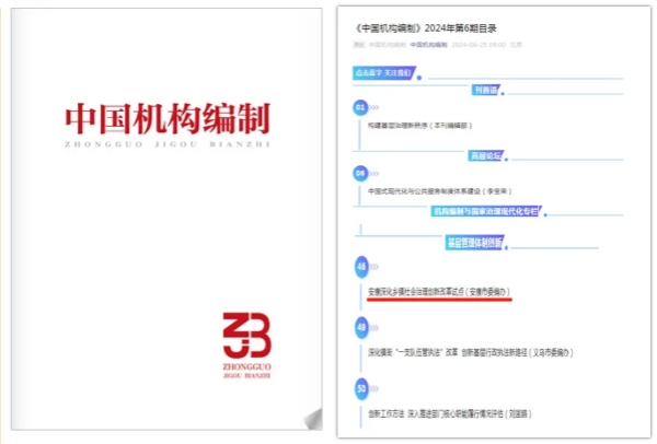 6月25日,《中國機(jī)構(gòu)編制》2024年第6期以題為《安康深化鄉(xiāng)鎮(zhèn)社會治理創(chuàng)新改革試點(diǎn)》刊發(fā)我市深化鄉(xiāng)鎮(zhèn)社會治理創(chuàng)新改革試點(diǎn)經(jīng)驗(yàn)文章,這也是繼《安康推進(jìn)機(jī)構(gòu)編制監(jiān)督檢查全覆蓋》、《部門機(jī)構(gòu)編制事項(xiàng)動議初探》、《深化審批服務(wù)便民化改革》,我市機(jī)構(gòu)編制管理創(chuàng)新經(jīng)驗(yàn)和調(diào)研成果第四次在全國機(jī)構(gòu)編制系統(tǒng)最高權(quán)威期刊“上榜”。