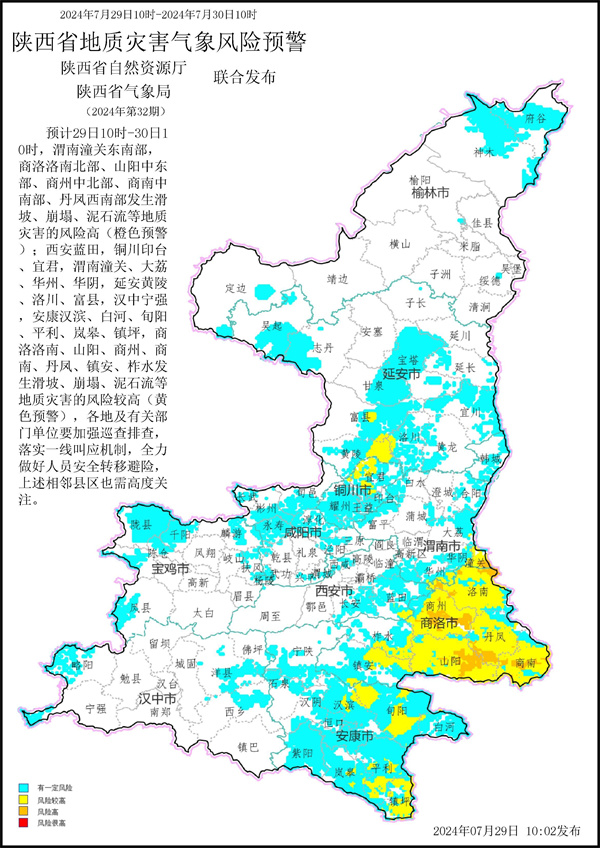 陜西省自然資源廳與陜西省氣象局聯(lián)合發(fā)布地質(zhì)災(zāi)害氣象風(fēng)險(xiǎn)預(yù)警:7月29日10時(shí)至7月30日10時(shí),下圖所示縣(區(qū))可能發(fā)生地質(zhì)災(zāi)害:其中我市漢濱、白河、旬陽(yáng)、平利、嵐皋、鎮(zhèn)坪發(fā)生滑坡、崩塌、泥石流等地質(zhì)災(zāi)害的風(fēng)險(xiǎn)較高(黃色預(yù)警),各地及有關(guān)部門單位要加強(qiáng)巡查排查,落實(shí)一線叫應(yīng)機(jī)制,全力做好人員安全轉(zhuǎn)移避險(xiǎn),上述相鄰縣區(qū)也需高度關(guān)注。
