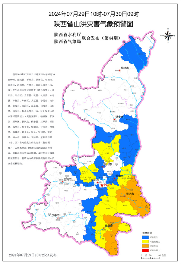 陜西省水利廳與陜西省氣象局聯(lián)合發(fā)布山洪災(zāi)害氣象預(yù)警:預(yù)計(jì)7月29日10時(shí)至7月30日9時(shí),下圖中所示縣(區(qū))可能發(fā)生山洪災(zāi)害,其中我市漢濱區(qū)、嵐皋縣、白河縣發(fā)生山洪災(zāi)害可能性較大(黃色預(yù)警),漢陰縣、寧陜縣、紫陽(yáng)縣有可能發(fā)生山洪災(zāi)害(藍(lán)色預(yù)警),各級(jí)水利部門要加強(qiáng)山洪隱患巡查排查,做好山洪災(zāi)害站點(diǎn)監(jiān)測(cè),及時(shí)發(fā)布區(qū)域風(fēng)險(xiǎn)預(yù)警信息,地方政府應(yīng)依法提前組織人員安全轉(zhuǎn)移避險(xiǎn)。