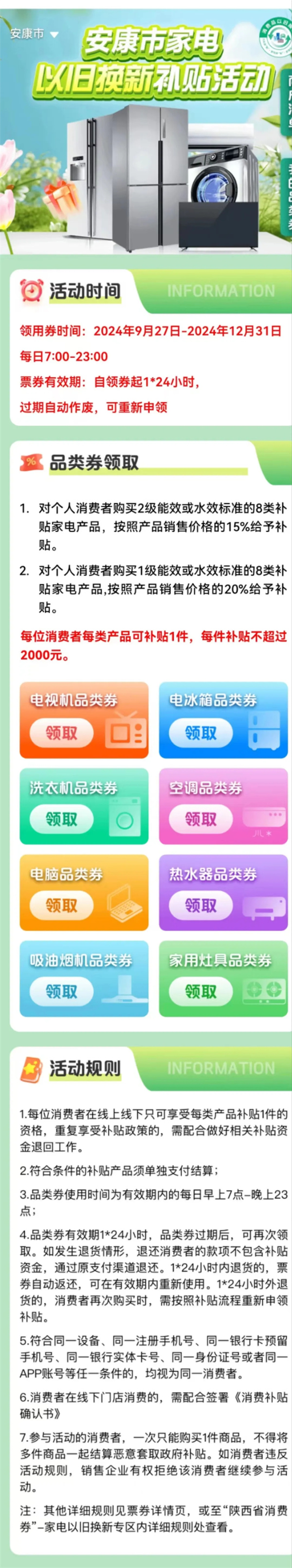 ※進入“陜西省家電以舊換新專區(qū)-安康品類券”頁面。