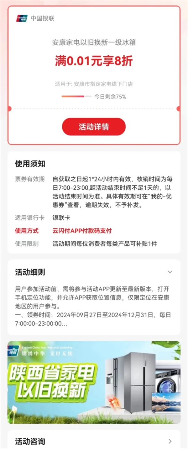 3.查看與使用:領取成功后,您可以在云閃付APP“我的-獎勵-我的票券”中查看已領取的消費券。在參與活動的家電銷售門店選購指定家電產(chǎn)品時,出示并使用消費券,即可享受相應折扣。