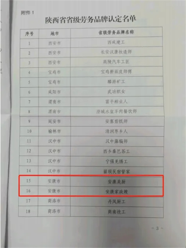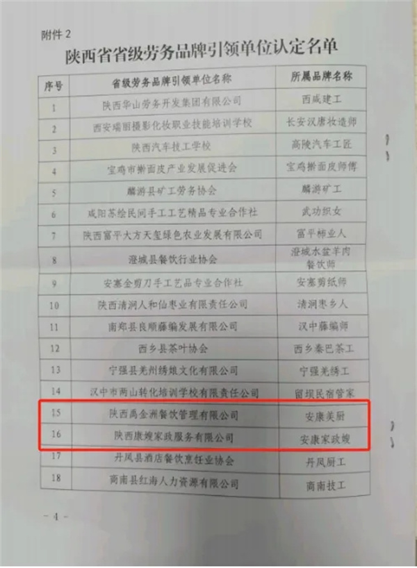 12月3日,陜西省人力資源和社會保障廳、陜西省財政廳公布2024年陜西省省級勞務(wù)品牌認(rèn)定名單及2024年陜西省省級勞務(wù)品牌引領(lǐng)單位認(rèn)定名單,我市兩個勞務(wù)品牌——安康美廚、安康家政嫂,兩家勞務(wù)品牌引領(lǐng)單位——陜西禹金洲餐飲管理有限公司、陜西康嫂家政服務(wù)有限公司分別入選。
