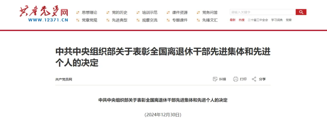 12月30日,中共中央組織部對(duì)150個(gè)全國離退休干部先進(jìn)集體和450名先進(jìn)個(gè)人進(jìn)行表彰,我市退休干部陳守業(yè)榮獲“全國離退休干部先進(jìn)個(gè)人”。