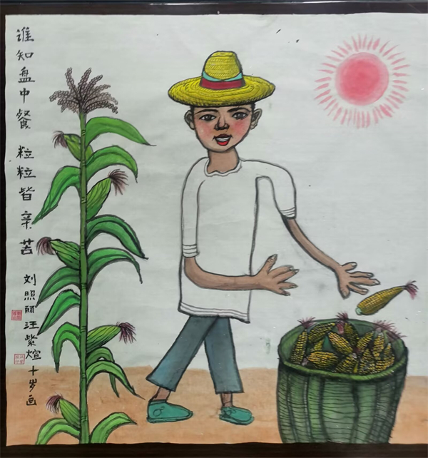 四年級(jí)的汪紫煊在參加夏令營(yíng)時(shí),在玉米田里看到一幕,深深地吸引了她,一位農(nóng)民伯伯戴著草帽在烈日下,把玉米裝進(jìn)筐里。曾經(jīng)學(xué)過的詩(shī)句在她腦海里浮現(xiàn),文字變成了立體的畫面,她為自己這幅畫起名《誰(shuí)知盤中餐 粒粒皆辛苦》。汪紫煊覺得,這種吃苦耐勞的精神要發(fā)揚(yáng),更要珍惜糧食,感受糧食的來之不易。