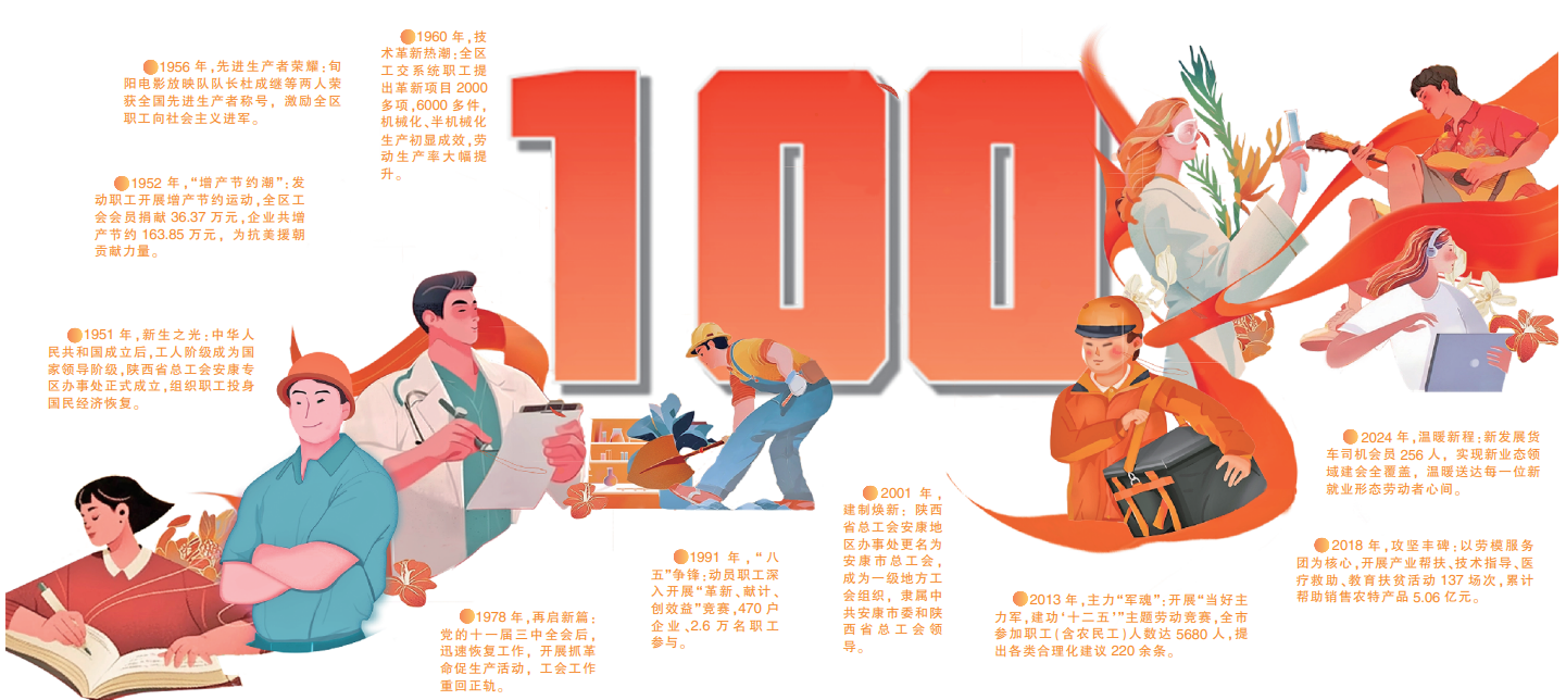 2025年,是全國總工會成立100周年,作為工人階級和廣大勞動群眾的堅(jiān)強(qiáng)后盾,全國總工會為我國的社會進(jìn)步和經(jīng)濟(jì)發(fā)展做出了不可磨滅的貢獻(xiàn)。安康工運(yùn)事業(yè)從1925年漢水畔第一聲“勞工萬歲”的吶喊,到深度參與三線建設(shè)、脫貧攻堅(jiān)、生態(tài)經(jīng)濟(jì)等重大戰(zhàn)略,再到新時代百萬職工投身幸福安康建設(shè)的鏗鏘步履,始終與黨的事業(yè)血脈相連,與城市發(fā)展同向同行。