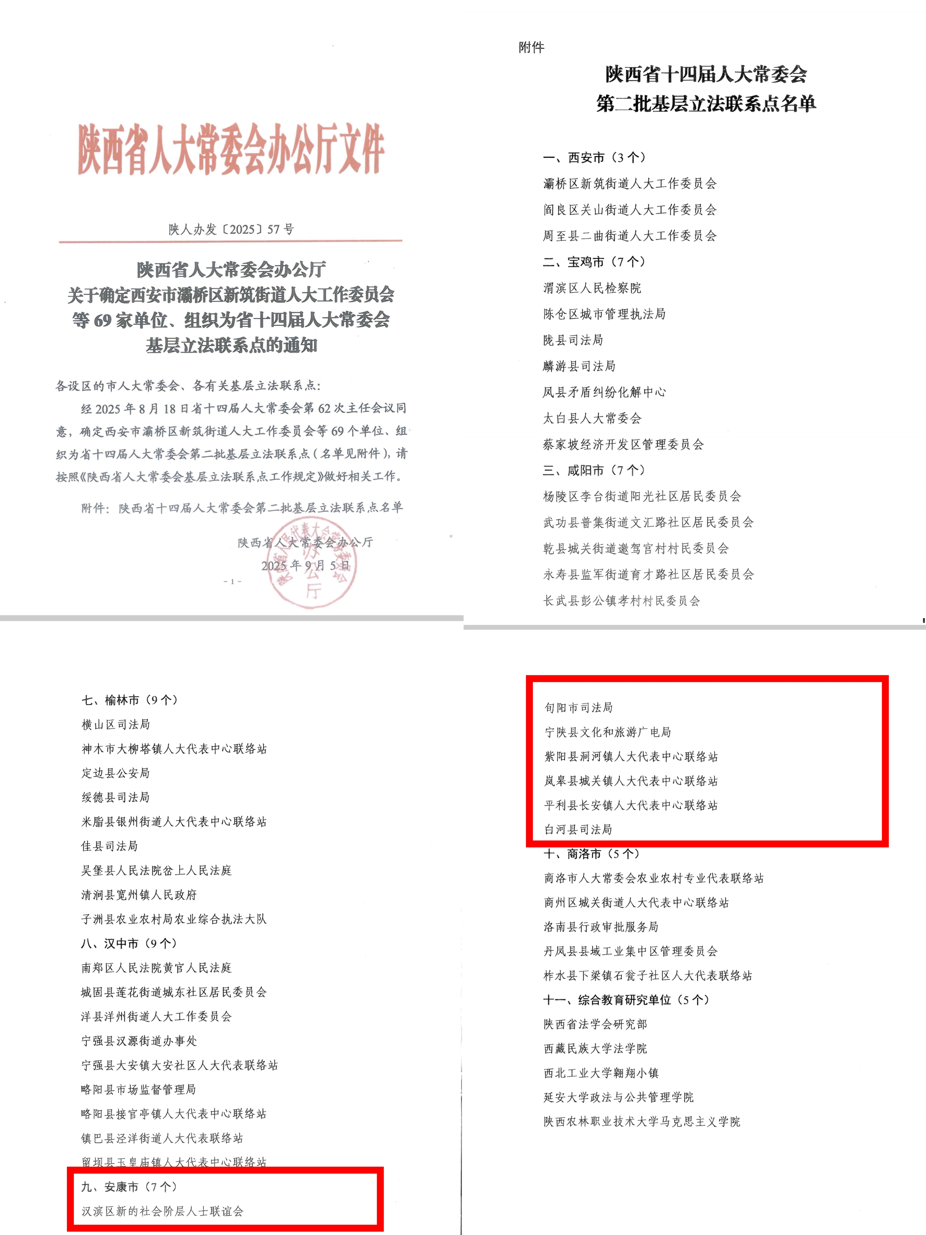 本網(wǎng)訊(通訊員 段文貞)9月5日,省人大常委會(huì)公布《陜西省十四屆人大常委會(huì)第二批基層立法聯(lián)系點(diǎn)名單》,我市漢濱區(qū)新的社會(huì)階層人士聯(lián)誼會(huì)、旬陽市司法局、寧陜縣文化和旅游廣電局、紫陽縣洞河鎮(zhèn)人大代表中心聯(lián)絡(luò)站、嵐皋縣城關(guān)鎮(zhèn)人大代表中心聯(lián)絡(luò)站、平利縣長安鎮(zhèn)人大代表中心聯(lián)絡(luò)站、白河縣司法局7家單位、組織成功入選。這是繼2023年省人大常委會(huì)在我市確立首批4個(gè)基層立法聯(lián)系點(diǎn)以來,通過綜合考核、嚴(yán)格篩選再次確立的7個(gè)基層立法聯(lián)系點(diǎn),實(shí)現(xiàn)了全市各縣(市、區(qū))全覆蓋。