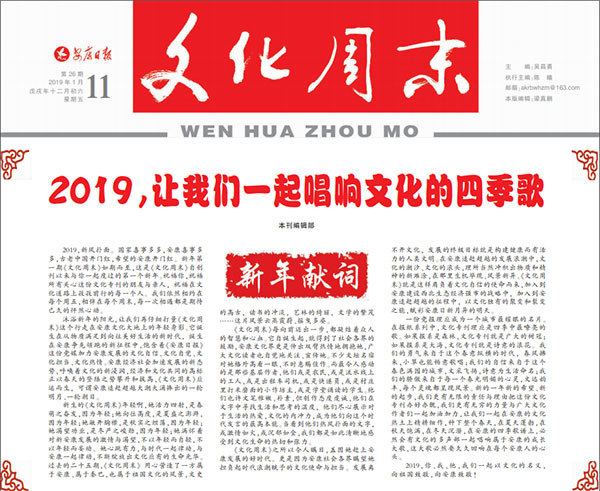 2019,新風(fēng)撲面。國(guó)家喜事多多,安康喜事多多,古老中國(guó)開(kāi)門(mén)紅,希望的安康開(kāi)門(mén)紅。新年第一期《文化周末》如期而至,這是《文化周末》自創(chuàng)刊以來(lái)與你一起度過(guò)的……
