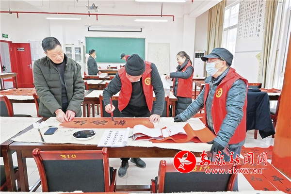 走貧困村、進社區(qū)、上街頭為群眾義寫春聯(lián)是市老干中心(安康老年大學)每年辭舊迎新的傳統(tǒng)活動。今年,按照疫情防控有關要求,為盡量減少人員聚集,活動當天,書畫學會臨時黨支部組織書畫系10名優(yōu)秀學員和黨員骨干志愿者在學校書畫教室統(tǒng)一創(chuàng)作。他們用半天時間創(chuàng)作了近200幅春聯(lián),“與其千里返鄉(xiāng)隔離十四天,不如就地打工多賺五六千,就地過年好”等一幅幅緊扣當下、通俗易懂的“抗疫”春聯(lián)與謳歌新時代、弘揚新民風、傳承民俗文化的主題相結合,充分體現(xiàn)了廣大老同志桑榆未晚、發(fā)揮余熱的精神風貌及康樂有為、樂善有恒的志愿服務精神。