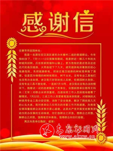 從感謝信中獲知:家住漢濱區(qū)建民辦長春村二組的尤大爺年近八旬,因7月11—12日強降雨導致附近一棵幾十年的大樹被風刮倒,壓在他家院墻和山墻上,更為危險的還危及近在咫尺的高壓線路。供電部門對高壓線路的樹枝做了清理,但因倒塌大樹粗壯,樹干太長,沒有專業(yè)工具處理,仍存在較大安全隱患。老大爺突然想到曾在路邊看到市政人員對行道樹進行修剪,于是抱著試試的心態(tài)撥打了安康市市政園林處電話。接到求助后,該處綠化管護科當天下午派了2名專業(yè)人員趕往現(xiàn)場,對該樹干進行分段切割移除,解決了困擾老大爺?shù)男念^大患。老大爺對市政園林處及時高效辦理群眾煩心事、操心事非常感激,連夜寫信并通過快遞形式寄到市政園林處。一封感謝信只是市政園林處踐行開展黨史學習教育“我為群眾辦實事”主題實踐活動的一個縮影。自黨史學習教育以來,市政園林處以學踐用,以學促干,累計為群眾辦實事11件,扎實推進市政園林項目建設,社區(qū)群眾自發(fā)送來錦旗2面,各級媒體爭相報道。