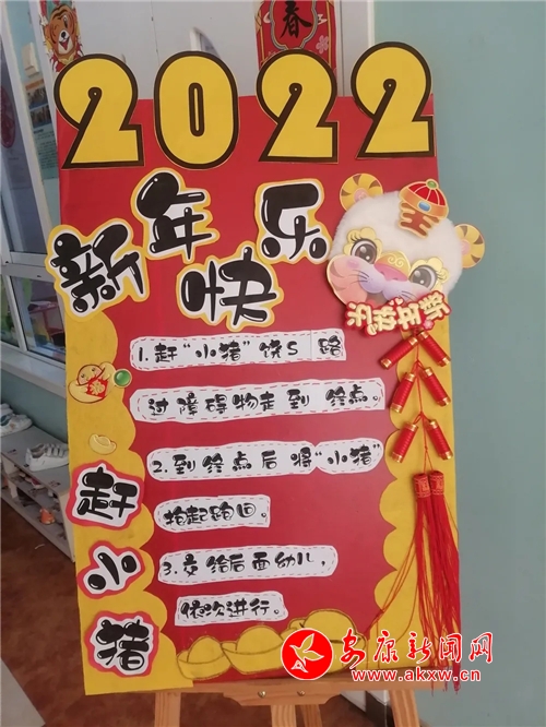 游戲“享”元旦。根據(jù)孩子的興趣愛好,設計不同類的游戲項目,以闖關的形式玩游戲,孩子們在游戲中既鍛煉了身體,又收獲了快樂。