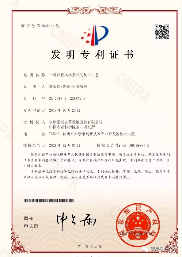 近日,由安康秦漢古茶發(fā)展股份有限公司和中國農業(yè)科學院茶葉研究所聯(lián)合申報的發(fā)明專利“一種漢代風格茶葉的加工工藝”獲得國家知識產權局授權(專利號:ZL201811238852.9),自此安康最早的茶有了法律保障(專利法)。