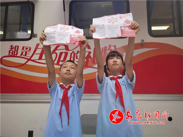 隨后,在采血車內,醫(yī)務人員從血液成分、獻血條件、獻血流程等方面為孩子們現(xiàn)場講解。孩子們?yōu)橹驹刚攉I花,表達敬意。