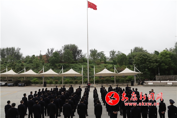 9時整,升國旗儀式正式開始。全體干警精神飽滿,整齊列隊,護(hù)旗手邁著矯健的步伐將鮮艷的五星紅旗護(hù)送至升旗臺。伴隨著雄壯嘹亮的國歌聲,五星紅旗冉冉升起,全體干警莊嚴(yán)肅立,向國旗行注目禮。
