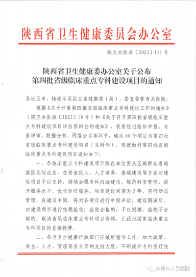 近日,陜西省衛(wèi)生健康委發(fā)文公布了第四批省級(jí)臨床重點(diǎn)?平ㄔO(shè)項(xiàng)目名單,安康市人民醫(yī)院腫瘤內(nèi)科名列其中,順利被評(píng)定為省級(jí)臨床重點(diǎn)?平ㄔO(shè)項(xiàng)目。
