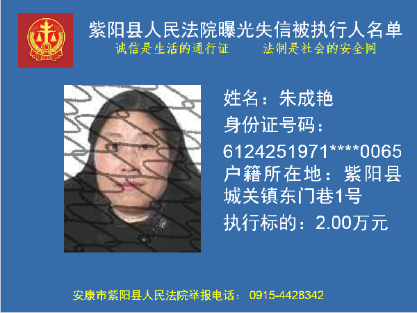 被執(zhí)行人朱成艷,你因不履行(2017)陜0924民初241號民事判決書確定的義務,已被紫陽縣人民法院納入失信被執(zhí)行人名單庫依法進行信用懲戒。信用懲戒范圍包括但不限于以下措施: