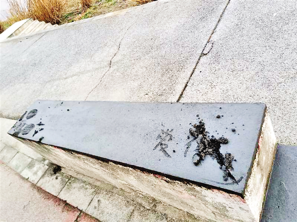 清晨跑步途徑江邊步道,一位施工的師傅和江灘公園保潔員說:“在擋護墩上刻字,太不文明了!弊叩礁,才知道是昨天下午剛剛施工結(jié)束的擋護墩,還未完全凝固的……