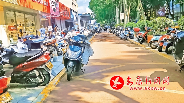 6月23日,金州南路東側(cè),摩托車、電動車停放在公交港灣,存在安全隱患。(記者 吳單 攝)……