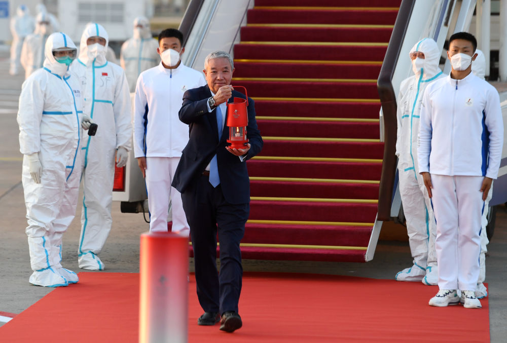 ⬆️今晨抵達(dá)機(jī)場后,北京冬奧組委特別代表、北京冬奧組委副主席于再清手持火種燈走向展示臺。ban安康新聞網(wǎng)